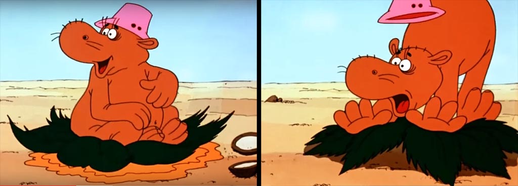 Герои и предметы под палящим африканским солнышком отбрасывают явные черные тени, все, кроме той самой пальмы. Обвинять дерево в вампирстве глупо, к тому же, потом тень от кроны под бегемотом вроде как появилась. Или это песок под зверем по каким-то испуганным причинам потемнел — либо одно, либо второе.