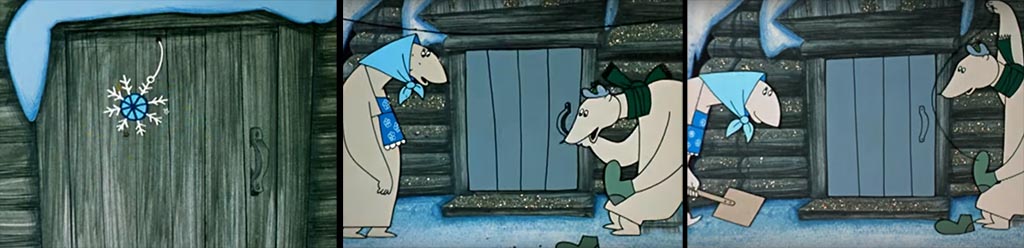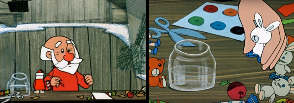 Здесь же можно наблюдать чудеса передвижений на столе. Дом, стоящий аккурат на Северном полюсе, просто не может быть обставлен простой бездушной мебелью — так что неудивительно, что на столе царит хаос необъяснимых перемещений. Повторно раскрашенный Дед Мороз был поставлен к банке, справа (слева для нас) от главного героя. Рядом с банкой никаких зайцев не наблюдается. Они неожиданно появляются в следующих кадрах.
