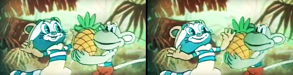 Вот классический пример с исчезновением, причем двойным: сначала на пальме висит три кокоса, но в процессе жестокого втаптывания пальмы в песок их уже нет. Про цвет листвы даже спрашивать не будем.