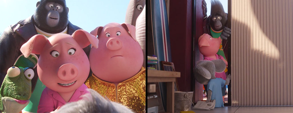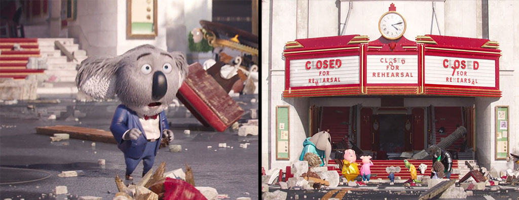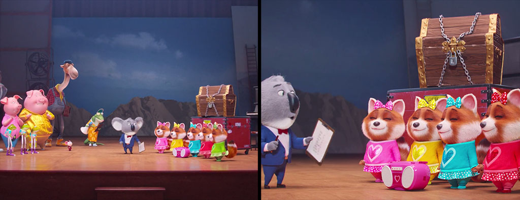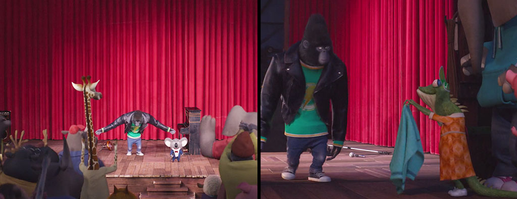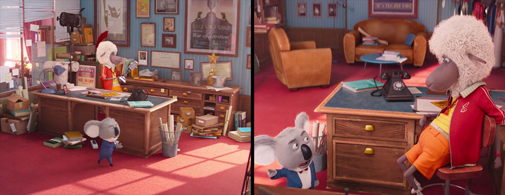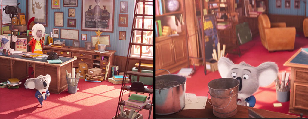 И даже старушка мисс Ползли совсем не такая медлительная, как вам могло казаться. Посмотрите, как резко она отошла от двери во время мотивационного визита к Бастеру — стояла рядом, а на втором кадре едва ноги вдалеке виднеются. «Да, верю» — только и успел за это время сказать непутевый хозяин театра.