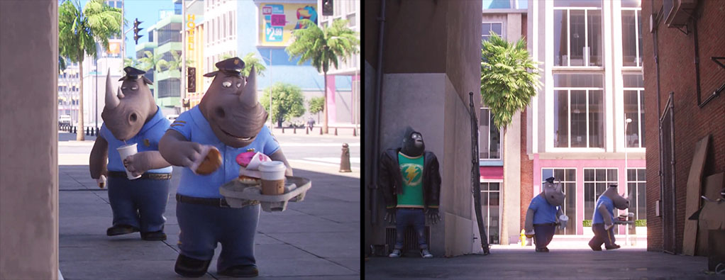 Но это мы все про зверей, а ведь способностью моментального перемещения в «Зверопое» обладают многочисленные предметы и даже еда. Вот у носорога-полицейского сверху розовый пончик, а на следующем же дальнем плане он точно лежит внизу, поменявшись местами с белым. Борьба за право быть последним съеденным? Или первым?