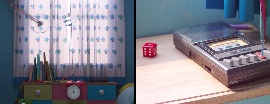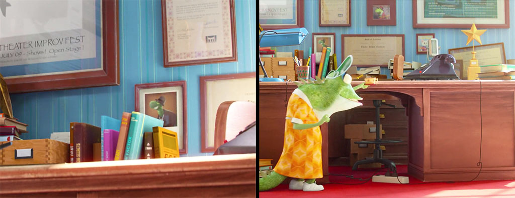 К слову о столах: как часто заведено в мультфильмах, расположение предметов на них может варьироваться вне всякой логики и объяснений. Стол Бастера Муна — не исключение. За перемещениями замечен целый комплект различной канцелярии, например банка с карандашами.