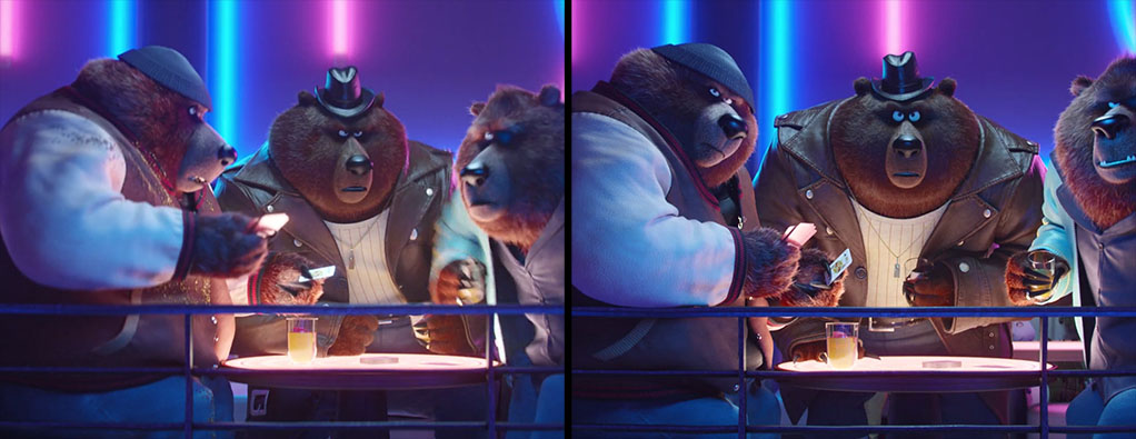 Второй случай — типичное мультяшное «самоочищение», когда один из трех грозных медведей выплюнул на напарника содержимое своего стакана, а через несколько кадров жилетка и кофта пострадавшего абсолютно чистые и сухие. Хотя, насчет «чистые» тут сложно сказать наверняка, но капель точно не видно. Кстати, уровень жидкости в стакане медведя справа после плевка даже увеличился, а не уменьшился. Капли просто вернулись с жилетки обратно в стакан?